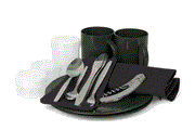 - Large front pocket opens into a fold out utensil store containing: 2 x stainless steel knives, forks, spoons and teaspoons, 2 x round green plates, 2 x green mugs, 1 x corkscrew, 1 x large screw top tubs, 2 x small screw top tubs, 1 x Micro fleece towel