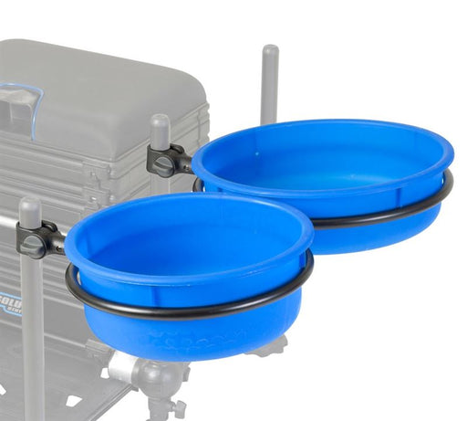 A rigid plastic groundbait bowl and angled fixing hoop for attaching directly to seatbox or platform legs. Groundbait can be mixed in the bowl prio...