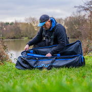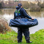 Preston Innovations Supera X Roller & Roost Bag XL, a large capacity carryall designed to take two Absolute XL Pole Rollers plus additional accessories. Manufactured from a tough hardwearing 840D material with a reinforced base. With two outer pockets, oversized durable zips and a detachable padded carrying strap.