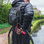 The Fox Rage Net Magnet 5kg, a compact powerful magnet with two carabiners and a split ring for versatile securing options. Possibly the ultimate way to carry your net when roving the bank allowing for a super fast deployment when needed.