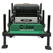 The Sensas World champion 3410 box in Black and Green features a built-in seatbox design with a cushion made from special resin. It includes a sliding footplate, two half drawers with storage trays, and an adjustable clasp system. For enhanced stability, the box is equipped with 180-degree leg locks that have an anti-slip mechanism.