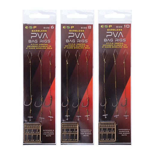 View full detailsESP PVA Bag Rigs, short 4 inch rig featuring PTFE coated Cryogen Classic hooks carefully tied to ESP Camo Sinklink braid. Produced in house in our ...