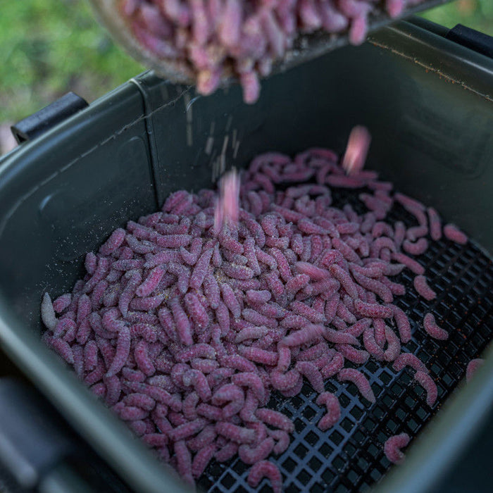 Korum EVA Bait Station, a neat compact bait storage solution with two inner trays that clip inside the lid. With one of those trays featuring a 3mm mesh base for riddling maggots and groundbait. Both trays will also clip to the outside of the bag, ideal for keeping organised when your prepping and preparing. With plenty of room beneath the trays for additional bait tubs, bags of pellets and boosters and additives.