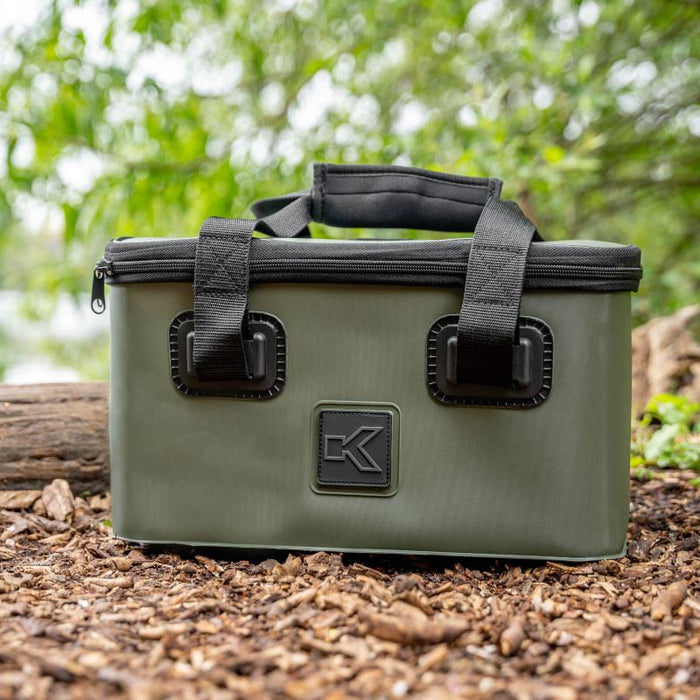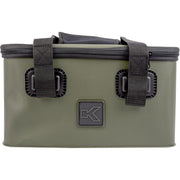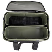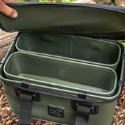 The Korum EVA Tackle & Bait Station comes with two internal EVA trays. Stacking neatly inside the main bag for transport, with room underneath for a couple of bait tubs. The trays can then be clipped to the outside of the bag when in use. One of those trays also has a 3mm mesh base for riddling natural baits and sieving groundbait on the go.
